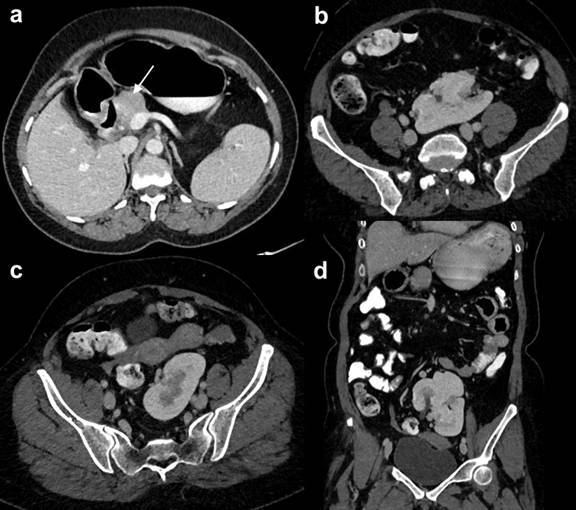 Figure 1. Axial and coronal CECT images showing head and uncinate process of the pancreas (arrow) with non-visualization of neck, body and tail. Kidneys are located at the level of bifurcation of aorta in midline and they are fused suggestive of pancake kidney. |