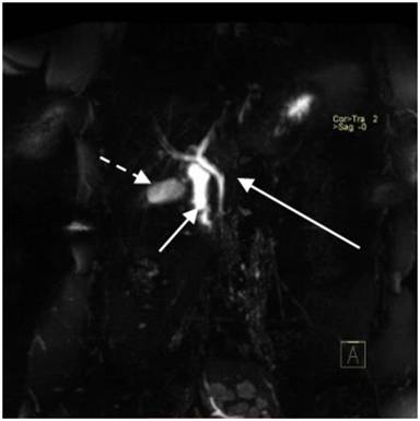 Figure 3. MRCP image showing common bile duct and ventral pancreatic duct (long arrow) draining head of the pancreas and non-visualization of dorsal pancreatic duct. Also seen are second part of the duodenum (short arrow) and gall bladder (dashed arrow). |