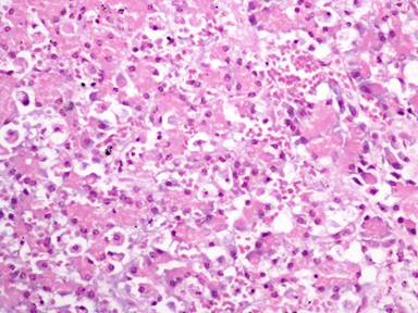 Figure 2. Effects of acute ischemia and reperfusion on pancreatic histology. The main feature in this field is the distortion of pancreatic histology. Note the significant hemorrhage, the moderate interlobular and intralobular edema and the presence of some necrotic foci (15-35%). H&E x400. |
