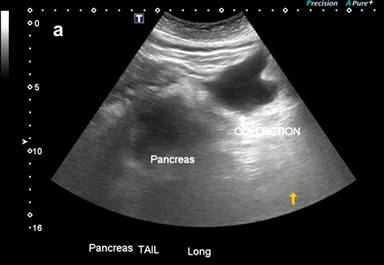 An ultrasound was performed in the emergency which revealed a thickened pancreas and 140 mL of peripancreatic fluid collection at the pancreatic tail. There was fatty infiltration of liver but no gallbladder involvement (Figure 1a). Antibody testing for autoimmune pancreatic insulin insufficiency did not show any abnormalities except a low C-peptide (Table 3). HbA1C was 13.1%. The septic screen performed at initial presentation was normal.