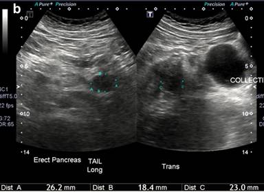 He was commenced on a normal diet day 3 of his admission. Repeat ultrasound showed resolution of pancreatic inflammation and a well-defined hypoechoic region adjacent to the pancreatic tail consistent with a pseduocyst (Figure 1b). He had an additional hypoechoic region in the body of the pancreas suggestive of residual edema.