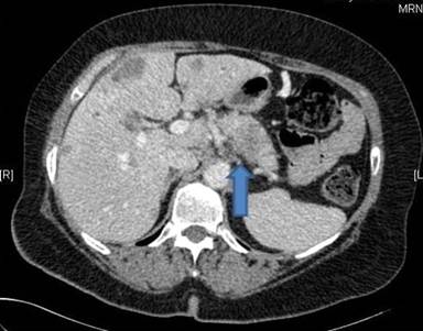 Figure 1. CT-scan of our patient in February 2011: tumor in pancreatic tail-region marked with the blue arrow. |