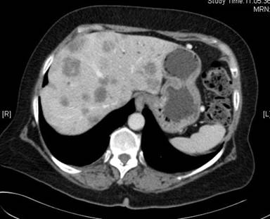 Figure 2. CT-scan of our patient in February 2011: several metastases in both lobes of the liver. |