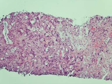 Figure 3. Histology of a liver biopsy (HE; 1:100) done in Feb. 2011. Liver tissue infiltrated a poorly differentiated adenocarcinoma, most probably originating from the pancreatic tail. |
