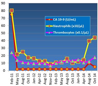 Figure 4. Follow up laboratory parameters during chemotherapy (February 2011 to April 2014) and afterwards. CA 19-9: red line; neutrophils: yellow line; thrombocytes: magenta line |