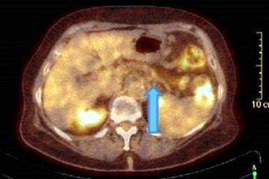 Figure 5. PET-CT-scan in May 2014. The blue arrow marks the pancreatic tail-region. |