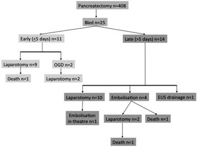 Figure 1. Flowchart of the treatment modalities employed for post-pancreatectomy haemorrhage in this study. |