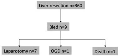 Two patients did not have surgical intervention for the bleeding. One patient bled from gastric varices secondary to splenic vein occlusion; this was successfully managed endoscopically. One patient had rapid circulatory arrest and died following evidence of blood in the drains. Post-mortem examination suggested haemorrhage from the hepatic resection margin as the likely cause of death.