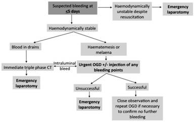 Analysis of our experience with post-operative haemorrhage has led us to develop an algorithm for the suggested management of bleeding based on the timing of the onset of bleeding. Early post-operative bleeding usually occurs either from the site of dissection or intraluminally from one of the enteric anastomoses. Management of bleeding in this group therefore requires early re-laparotomy or urgent endoscopy respectively; this is illustrated by the algorithm in Figure 3.