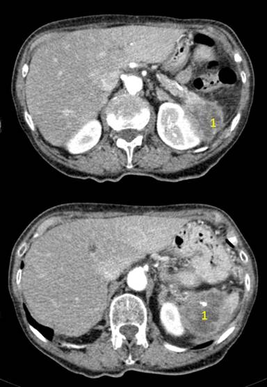 Figure 1. Preoperative imaging. Abdominal CT showing an infiltrative mass (1) Invading the tail of the pancreas, spleen and left kidney. |