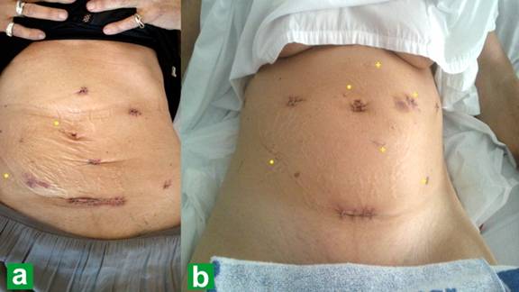 Figure 2. Positioning of the trocars and incision. For en bloc resection of the tail of the pancreas, spleen and left kidney (a.) and for pancreaticoduodenectomy (b.). Wart close to the umbilicus and prior McBurney incision demonstrating that this is the same patient (*). Incisions made by the trocars in the previous intervention shown in a. (+). |