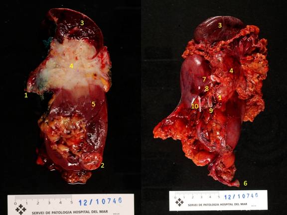 Figure 3. En bloc resection specimen of the pancreas, spleen and left kidney. (1) Pancreatic resection margin, (2) incidental renal carcinoma, (3) spleen, (4) primary pancreatic tumor, (5) left kidney, (6) left ureter, (7) splenic artery, (8) splenic vein, (9) left renal artery, (10) left renal vein. |