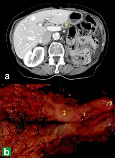 Figure 4. Diagnostic imaging and resected specimen for pancreaticoduodenectomy. a. Abdominal CT showing dilatation of the pancreatic duct (1). b. Surgical resection specimen: (2) pancreatic tumor, (3) distal margin of the pancreatic remnant. |
