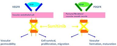 Sunitinib (previously known as SU11248) is an oral, small-molecule, multi-targeted receptor tyrosine kinase inhibitor. These include all receptors for platelet-derived growth factor (PDGF-Rs) and vascular endothelial growth factor receptors (VEGFRs), which play a role in both tumor angiogenesis and tumor cell proliferation (Figure 4).