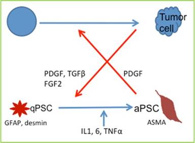 Figure 1. Factors responsible for the activation of pancreatic stellate cells and the interaction between epithelial cells and stromal cells. The activation of quiescent pancreatic stellate cells (qPSCs, which are characterized by the expression of glial fibrillary astrocytic protein (GFAP) and desmin) into activated stellate cells (aPSC which are characterized by alpha-smooth muscle actin (ASMA) expression) is stimulated by multiple chemokines such as interleukins 1 and 6 (IL1, 6) and tumor necrosis factor-alpha (TNFα) and tumor cell derived factors such as platelet-derived growth factor (PDGF), transforming growth factor-beta (TGFβ) and fibroblast growth factor-2 (FGF2). Activated pancreatic stellate cells (aPSC) also contribute to the tumor epithelial cell phenotype. |