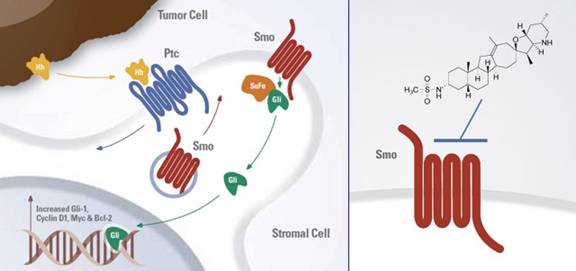 Figure 1. The hedgehog pathway and the interaction of tumor cells with stromal cell (left); the inhibitor of the smoothened (Smo) molecule, IPI-926 (chemical form on the right) (Adapted from the original abstract poster presented at the 2011 ASCO Annual Meeting [14]). |