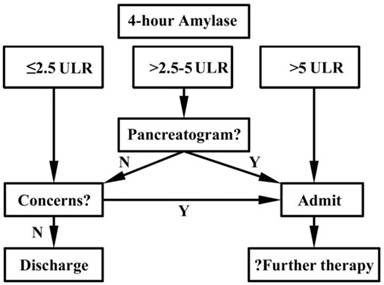 An ideal test for predicting post-ERCP pancreatitis would detect the majority of patients with severe episodes, and would be performed in a timely manner to facilitate same-day discharge. From our results, we propose that patients undergoing ERCP be treated according to whether or not a pancreatogram has been obtained. Patients who have undergone pancreatogram should be admitted if 4-hour amylase level is greater than 2.5 times the ULR. Patients who have not undergone pancreatogram should be admitted if 4-hour amylase level is greater than 5 times the ULR (Figure 1). Nevertheless, if there are other clinical concerns, or if the patient’s social circumstances make a same-day discharge inadvisable, admission may still be necessary in patients with a normal amylase level.