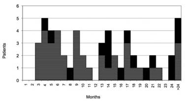 Figure 1. The number of patients who survived for each particular duration in months is depicted. Those who developed cholangitis are represented with darkened boxes, those who did not develop cholangitis are represented with horizontally lined boxes. Patients with a survival greater than 12 months had a higher rate of developing cholangitis compared to those who survived less than 12 months (P=0.017). |