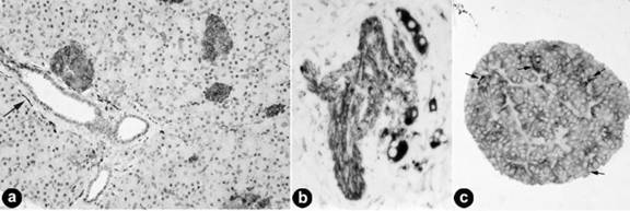 Figure 1. Reactivity of islet cells with anti-beta-tubulin antibody (beta-TA). All photos are converted to a grayscale model. a. Normal human pancreas processed with anti-tubulin antibody. All islet cells are stained strongly. Stronger stained small or larger sections of neural fibers are scattered throughout the tissue and in the peri-ductal area (arrow). ABC method; beta-TA (1:50 dilution), x70. b. Normal pancreas. Strong staining of nerve fibers and ganglia. Avidin-biotin complex method; beta-TA (1:50 dilution); x120. c. A normal islet of the Syrian hamster showing staining of virtually all islet cells. A few small and darker stained neural cells (arrows) are present. Avidin-biotin complex method; beta-TA (1:50 dilution); x80. |