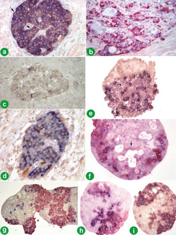 Figure 2. Multi-labeling of normal pancreatic islets. a. anti-insulin (blue) and beta-TA (brown). The color shift (brownish blue) indicates that most islet cells contain both insulin and beta-tubulin. However, there are a few cells, representing glucagon cells, stained with beta-TA only (arrows). Avidin-biotin complex method; 1:50 dilution; x80. b. Immunoreactivity of islet cells in the islets of PP-rich areas with anti-PP (red) and beta-TA (blue). None of the blue-stained PP cells are co-stained with the beta-TA as there are no color shifts. Avidin-biotin complex methods; 1:50 dilution; x120. c. An islet in the cancer area (Region A) stained with anti-insulin (blue) and beta-TA (brown). Note that the immunoreactivity of anti-insulin is reduced to a few cells, while beta-tubulin is present in most cells. Avidin-biotin complex method; 1:50 dilution; x120. d. In five cases of pancreatic cancer the expression of insulin (blue) and beta-tubulin (brown) was similar to the islets of the normal pancreas. Avidin-biotin complex method; 1:50 dilution; x120. e. Human islets in culture. Day 3. staining of islet cells with anti-insulin (blue) and beta-TA (red). The purple color indicates the co-expression of insulin and beta-tubulin. There are many weakly blue stained cells between the darker stained cells. The upper portion of the islet is necrotic. Avidin-biotin complex method; 1:100 dilution; x120. f. Day 12. The number of insulin cells (blue) co-expressing beta-tubulin (purple) has decreased and many cells express beta-tubulin only (red). There are many duct-like structures in the central core of the islets. Note that some cells lining the duct structures (arrow) are stained weakly with beta-TA. Avidin-biotin complex method; 1:100 dilution; x120. g. Day 5. The number of insulin cells (blue) decreased significantly and many cells express beta-tubulin (red). Avidin-biotin complex method; 1:100 dilution; x80. h. Day 5. A few glucagon cells (blue) intermingled with cells expressing beta-tubulin alone (red) or co-expressing glucagon (purple). Most parts of the islets are necrotic. Note ductular structures (top), surrounded by a few cells expressing beta-tubulin. Avidin-biotin complex method; 1:100 dilution; x120. i. The same islet as in h. showing cells that express insulin (blue), beta-tubulin (red), or both (purple). Avidin-biotin complex method; 1:100 dilution; x120. |