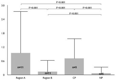 Figure 3. The number of neural cells/islet (number of dark cells/number of islet cells) in specimen from the normal pancreas, chronic pancreatitis and pancreatic cancer (mean±SE). Please see the text concerning the large standard errors. Region A: cancer area; Region B: tumor-free area; CP: chronic pancreatitis; NP normal pancreas from organ donor |