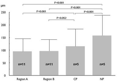 Figure 4. The size of islets in specimen from the normal pancreas, chronic pancreatitis and pancreatic cancer (mean±SE). Region A: cancer area; Region B: tumor-free area; CP: chronic pancreatitis; NP normal pancreas from organ donor |
