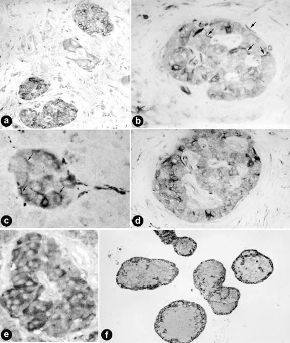 Figure 6. Pancreatic cancer. Immunoreactivity of islet cells with the beta-TA. In all sections, the avidin-biotin complex method and a dilution of 1:100 were used. All figures are converted to grayscale images. a. Three islets in the cancer area (Region A) with several neural cells within and in the periphery of islets. Weaker staining of islet cells and of cancer cells (center). x80. b. An islet primarily composed of neural cell with several varicose nerves (arrows) in the center and periphery. x120. c. A ganglion cell in the islet periphery extending its fibers between the weaker stained islet cells. There are several varicose nerves (arrows). Note the connection of the islet with a larger nerve fiber (right). x180. d. An atrophic islet in Region A surrounded by fibrous tissue. Several neural cells and fibers are seen. x120. e. In five pancreatic cancer specimens the staining of islet cells with beta-TA was strong and in granular form as in the normal pancreas. There were only a few discernible neural cells and fibers in these islets. x120. f. Cultured human islets at day 16. The central portion of all three islets was necrotic and the cells arranged in the islet periphery expressed beta-tubulin with occasional insulin and glucagon cells in between. x50. |