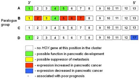 Figure 1. The arrangement of HOX genes in the mammalian genome and their potential roles in pancreatic development and cancer. |