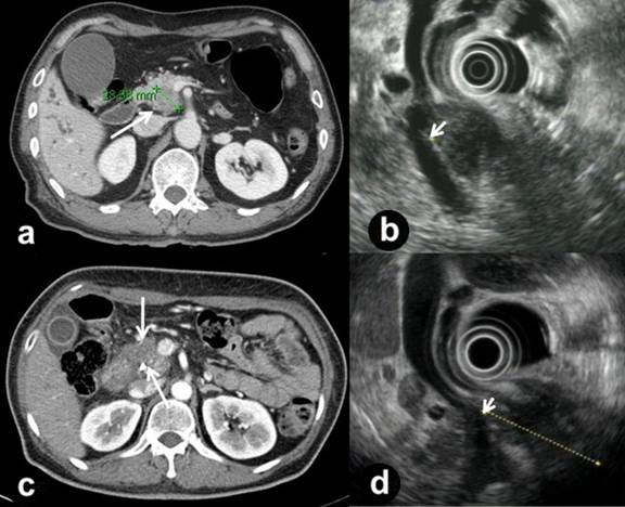 Figure 1. Preoperative imaging studies. a. CT of Case #1 showing pancreatic head cancer (arrow) with suspicious invasion to the portal vein. b. EUS of Case #1 revealing the tumor abutting on the portal vein (arrow). c. CT of Case #2 demonstrating pancreatic head cancer (arrows) invading the superior mesenteric-splenic-portal vein confluence. d. EUS of Case #2 clearly demonstrating the tumor abutting on the superior mesenteric-splenic-portal vein confluence (arrow). |