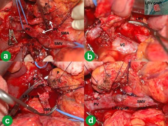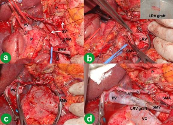 Figure 2. Operative findings of Case #1. a. Division of the splenic vein completely freed the specimen except for the abutting segment of the superior mesenteric-splenic-portal vein confluence. Arrows indicate the resected splenic vein. b. A segment of the left renal vein was grafted. c. A segment of the superior mesenteric-splenic-portal vein confluence was removed en bloc with the specimen and was reconstructed using a left renal vein graft. d. No tension was observed after reconstruction. LRV: left renal vein; P: pancreas; PV: portal vein; SMA: superior mesenteric artery; SMV: superior mesenteric vein; SV: splenic vein; VC: vena cava |