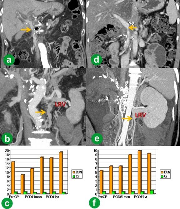 Figure 3. Follow-up of Cases #1 and #2. a. CT of Case #1 demonstrating a patent portal flow (arrow). b. CT of Case #1 showing development of collaterals (arrow) and a well-perfused left kidney. c. Postoperative follow-up serum creatinine levels of Case #1 were maintained within the normal range. d. CT of Case #2 showing a patent portal flow (arrow). e. CT of Case #2 revealing well-developed collaterals (arrow) and good perfusion of the left kidney. f. The postoperative follow-up serum creatinine levels of Case #2 were maintained within the normal range. Cr: creatinine; BUN: blood urea nitrogen; LRV: left renal vein; POD#1mon: 1-month postoperative; POD#1yr: 1-year postoperative; PreOP: preoperative |