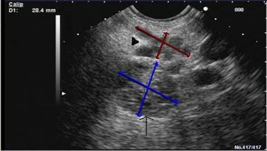 Figure 2. Endosonographic image displaying coexistent IPMN (arrow-head) and microcystic serous cystadenoma (arrow). |