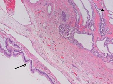 Figure 3. Histological slide demonstrating synchronous IPMN and serous cystadenoma. The arrow is on the IPMN and the arrowhead is on the serous (microcystic) adenoma. IPMN: tall columnar cells with basal nuclei and abundant mucinous cytoplasm lining a markedly dilated duct. Microcystic serous cystadenoma: multiple small cystic spaces lined by cells with round and central nuclei with clear cytoplasm. (H&E; original magnification: x25) |