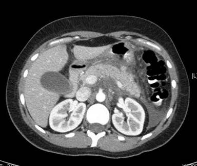Upon examination her blood pressure was 126/81 mmHg, heart rate 113 beats per minute, temperature 38.3 oC, respiratory rate 16 per minute, oxygen saturation 98% on room air. Her abdomen had normoactive bowel sounds and was soft with mild tenderness to palpation in the epigastrium without guarding, rebound or elicitation of Murphy’s sign. The remainder of her exam was normal as were baseline laboratory studies including a complete blood count, kidney and liver function, cholesterol panel and urine pregnancy test. Serum lipase was 280 IU/L (reference range: 0-128 IU/L), serum amylase was 58 IU/L (reference range: 30-150 IU/L). Serum IgG4 was 15 mg/dL (reference range: 11-112 mg/dL), an HIV test was declined, and a respiratory viral panel PCR was positive for influenza B.
