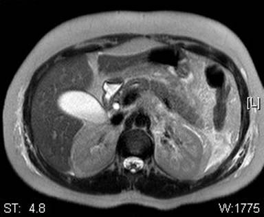 Figure 2. Previous CT changes seen in Figure 1 show T2 enhancement on MRCP. |