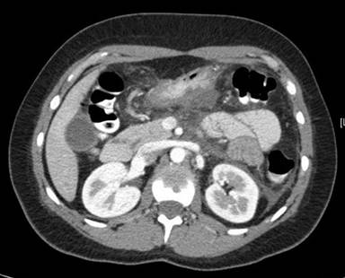 Figure 1. Extensive peripancreatic inflammatory changes and stranding is evident on the CT image shown here. Fluid is seen in the pericolic gutter and surrounding the liver. |