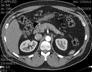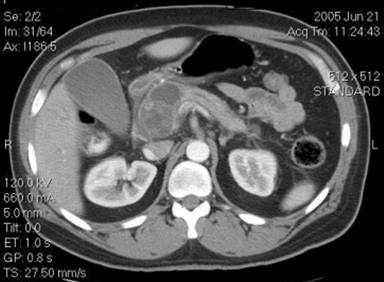 Figure 1. CT abdomen showing pseudocyst in the head of the pancreas compressing the common bile duct and duodenum. |