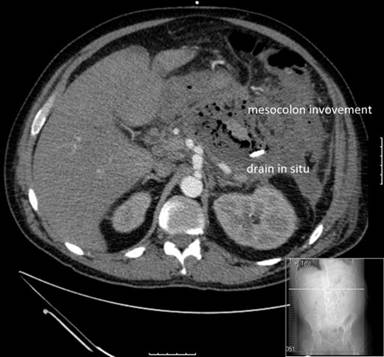 Figure 1. CT scan image showing involvement of mesocolon by pancreatic inflammatory process. |