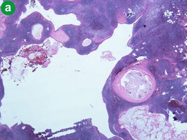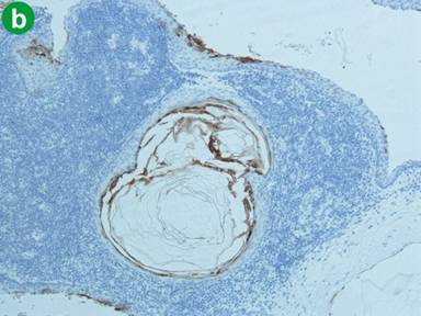Figure 2. a. Microscopic image of multiple cysts with stratified squamous epithelium within splenic parenchyma. b. Immunoperoxidase positivity for CEA in the epithelium of the cyst. |
