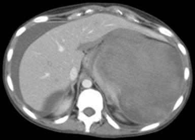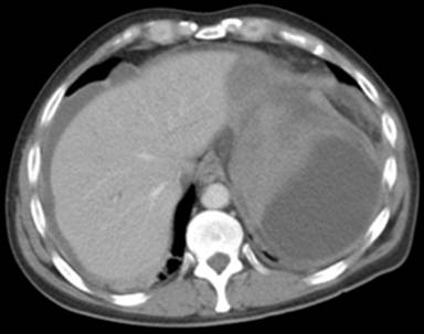 A 47-year-old man with known alcoholic pancreatitis for 10 years was admitted as an emergency with a twenty hour history of left upper quadrant pain radiating to his left shoulder. He was apyrexial and haemodynamically stable. His serum amylase was 245 U/L (reference range: 0-100 U/L) and the white cell count was 17.5 x109/L (reference range: 4-11 x109/L). A CT scan (Figure 1) showed a large sub-capsular fluid collection in his spleen. Twenty four hours later, he suddenly complained of worsening pain and became hypotensive. An urgent CT scan confirmed active bleeding with disruption of the sub-capsular splenic haematoma (Figure 2).