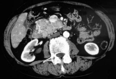 Figure 1. Abdominal CT scan showing a large and solid mass (9x5x8 cm in diameter) located in the head of the pancreas. |