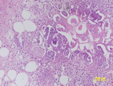 In December 2009, the patient underwent a pylorus-preserving pancreaticoduodenectomy. Histopathological examination showed an acinar cell carcinoma with angiolymphatic invasion and infiltration of the duodenal wall (pT3 N0 M0; R0) (Figure 4). After surgery, there was regression of the subcutaneous nodules (Figure 5) with normalization of the serum lipase levels.