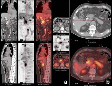 Figure 1. PET/CT composite (a.) and axial PET/CT images (b.) show diffuse tracer uptake by the pancreas (crosshairs). Case#1. |