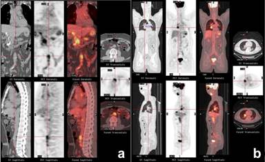 Figure 2. Composite PET/CT images show hypermetabolic peri-aortitis (a. crosshair) and right peri-hilar lesion (b. crosshair). Case#1. |