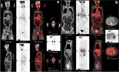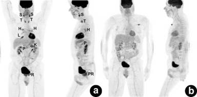 Figure 11. Serial coronal and sagittal pre- (a.) and post-corticotherapeutic (b.) PET maximum intensity projection (MIP) images show complete resolution of the diffuse hypermetabolic lesions of systemic IgG4-related sclerosing disease. The focus at the left upper anterior chest wall represents an artifact (b.). Case#2. S: salivary glands; T: thyroid gland; H: bilateral hilar nodes; L: right middle pulmonary lobe; K: upper pole of the left kidney; P: pancreas; PR prostate |
