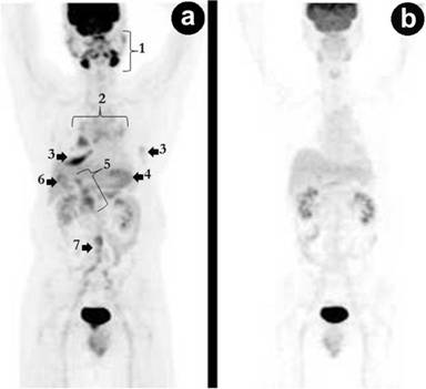 Figure 4. Serial PET coronal maximum intensity projection (MIP) shows pre-corticotherapy (a.) and 1-month post-corticotherapy with resolution of all hypermetabolic IgG4-related lesions (b.). Case#1. 1: salivary glands; 2: bilateral peri-hilar regions; 3: bilateral lower lungs; 4: pancreas; 5: porta-hepatitis/common bile duct; 6: gallbladder; 7: abdominal aorta |