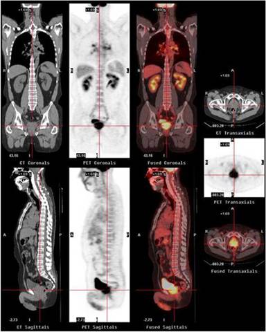 Figure 5. Composite PET/CT images show an intense tracer uptake by the prostate. Case#2. |