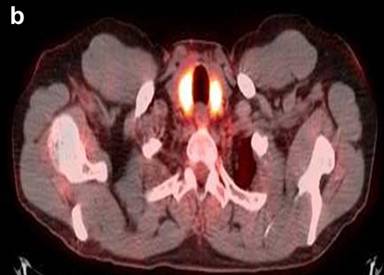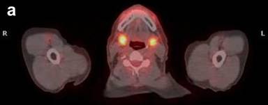 Figure 6. Axial fused PET/CT images show hypermetabolic lesions of the salivary glands (a.) and thyroid (b.). Case#2. |