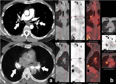 Figure 7. a. Contrast-enhanced CT (top) and fused PET/CT (bottom) axial images show hypermetabolic soft tissue thickening (arrows) with narrowing of the bronchial lumen bilaterally. b. Composite PET/CT images show lesions of the right hilar nodes (crosshair) and right middle pulmonary lobe (arrows). Case#2. |