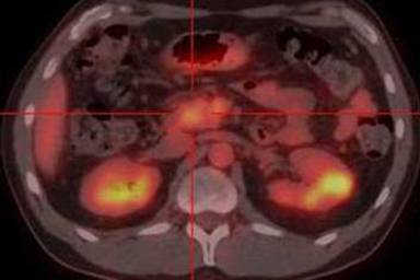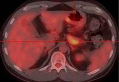 Figure 8. Axial fused PET/CT images show diffuse pancreatic tracer uptake (crosshair). Note that the patient only has diabetes mellitus type 2 but does not have any clinical symptoms of pancreatitis. Case#2. |